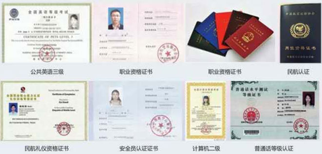 公共英语三级证书、民航岗位资格证书、民航礼仪资格证、安全员认证证书、计算机二级、普通话等级认证、国际航协航航空公司乘务课程合格证等。