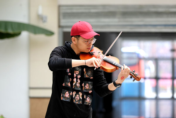 12:00,一阵悠扬的小提琴声从中心广场响起,演奏的正是大家耳熟能详的《我和我的祖国》旋律,正当大家寻找乐声来源时,六名主唱从人群中走出,《我和我的祖国》的歌声开始冉冉升起,回荡在青春广场上空。主唱演员或面对周围观众,或互相对望,深情动人的歌声感染了现场观众。