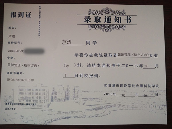 恭喜芦熠同学被我校录取【沈城建航空】
