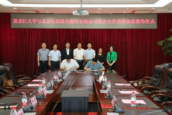 5月31日下午,我校与北京民用联合航空有限公司校企合作培训协议签约仪式在校常委会议室举行。北京民用联合航空有限公司副总经理马少红、培训中心主任徐磊、培训中心干事朱瑞敏;黑龙江大学副校长严明及教务处、应用外语学院、继续教育学院相关负责同志参加了仪式。签约仪式由继续教育学院院长孙勇主持。