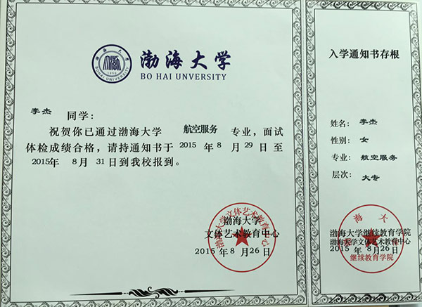 恭喜李杰同学被我校录取【渤海大学航空】