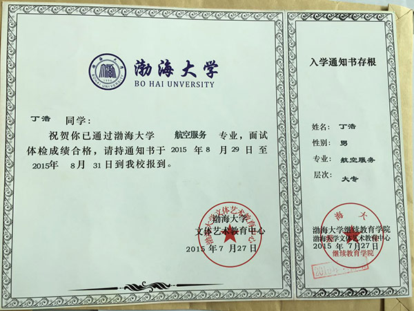 恭喜丁浩同学被我校录取【渤海大学航空】