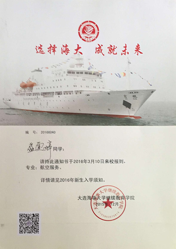 恭喜盛雯婷同学被我校录取【大连海事大学航空】