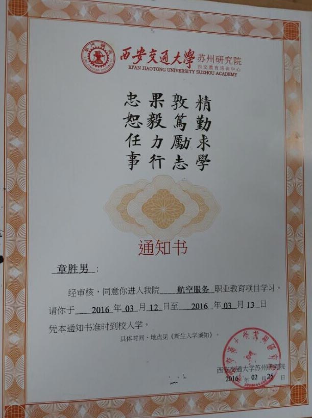 恭喜章胜男同学被我校录取【西交大苏州航空】