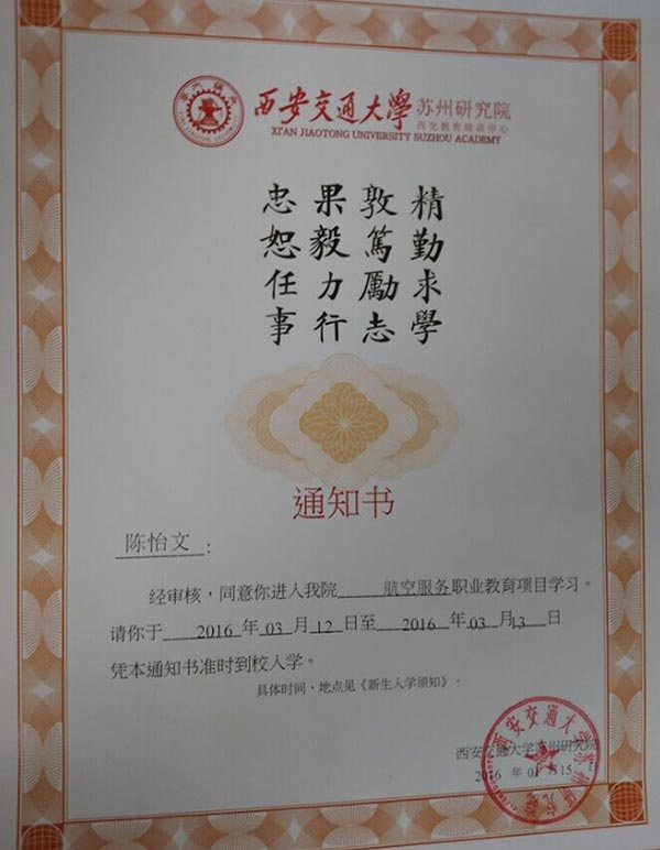 恭喜陈怡文同学被我校录取【西交大苏州航空】