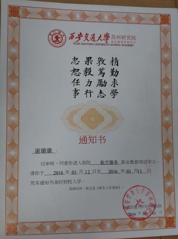 恭喜谢璐璐同学被我校录取【西交大苏州航空】