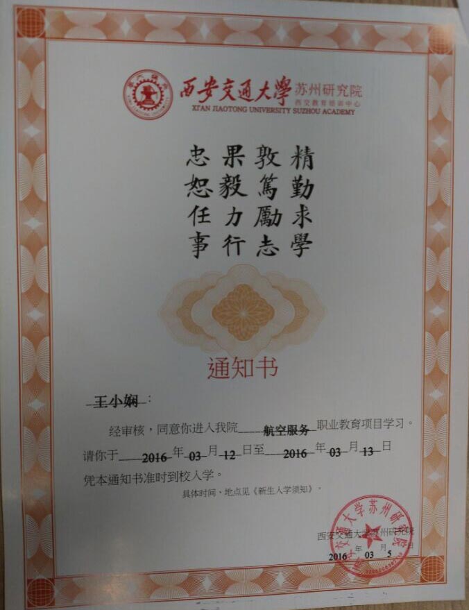 恭喜王小娴同学被我校录取【西交大苏州航空】