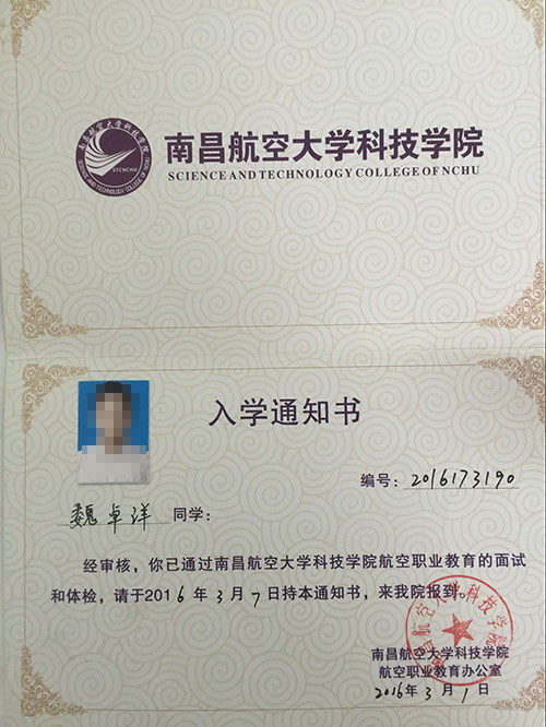 恭喜魏卓洋同学被我校录取【南航航空】