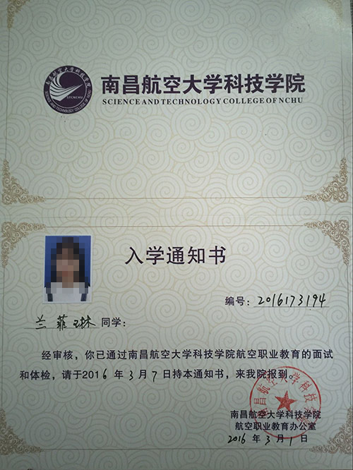 恭喜兰菲琳同学被我校录取【南航航空】
