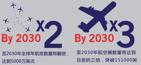 图1:ICAO估计,2030年前全球每年的航班数量将翻倍,达到5000万架次,航空器数目将达到目前的三倍,突破151000架。