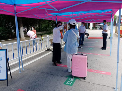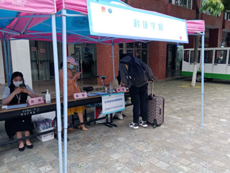 学生及家长从学校西门按照指示通道,保持1.5米以上距离排队——扫描安康码——测体温、查看安康码——行李消毒——到院系报到点登记并上交《健康状况承诺书》——新生报到——进入宿舍。完成报到流程。