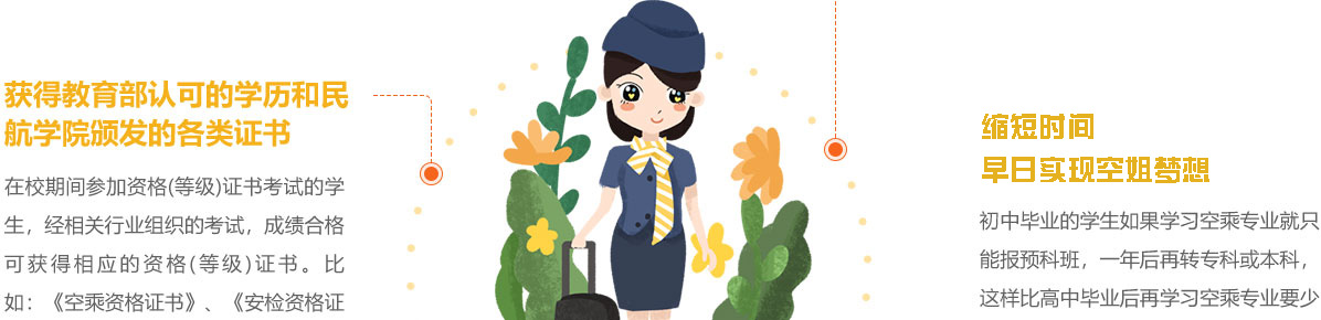 这是个令很多初中生及其家长头疼的问题,很多初中毕业生,不想把自己限制于一成不变初升高这样一成不变的升学模式中,但他们却还有自己的梦想,希望能按照他们的兴趣爱好学自己想学的专业。空乘专业越来越被中高考学生所喜爱,初中生意愿报空乘专业的也越来越越多,那么,初中生能否学习空乘专业?初中生能否跨过高中直接上大学学习呢?初中生可以通过报考航空院校开设的航空预科来实现,通过预科阶段的过渡学习再上航空院校空乘专业的专本科课程。预科阶段学习时间为1年,1年除学习高中阶段基础课程外还有空乘基本专业课程学习,更早的实现学生们的空姐愿望。